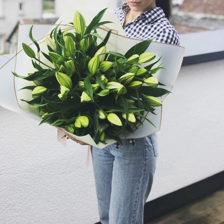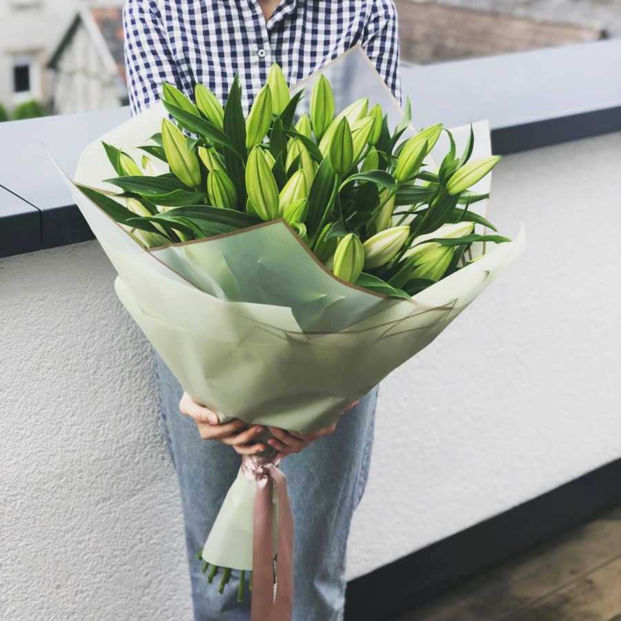 На фото букет из 15 лилий. В составе: лилия 15 шт, крафт-бумага 1 шт, атласная лента 1 шт, . Все цветы свежие и ароматные, букет красиво оформлен и отлично подходит для подарка. Доступна доставка цветов или самовывоз.